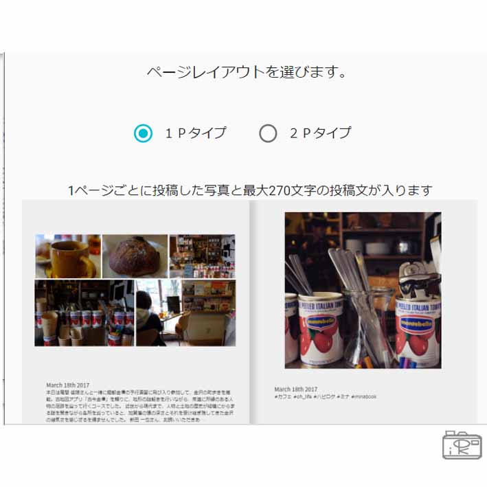 一投稿の写真と文を、一ページにレイアウトする「1Pレイアウト(写真)」と、