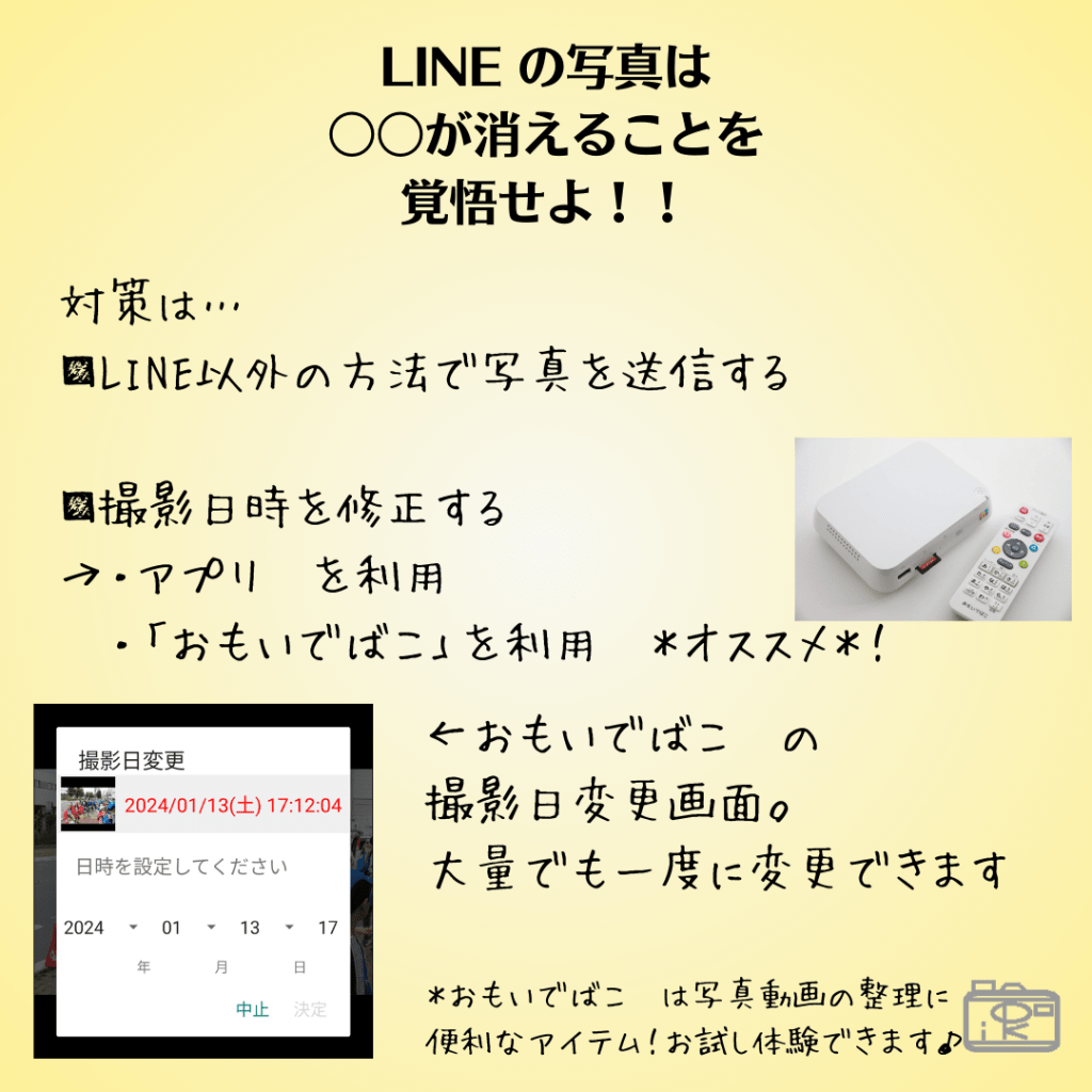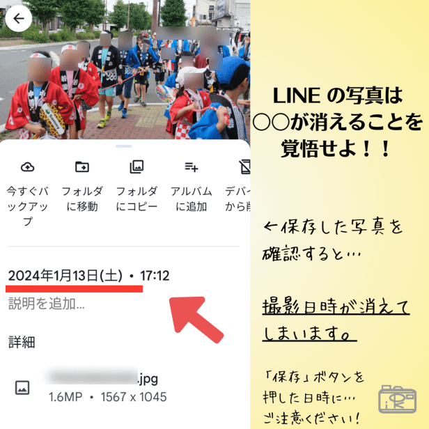 ▶LINE の写真は 撮影日時情報が消えます
