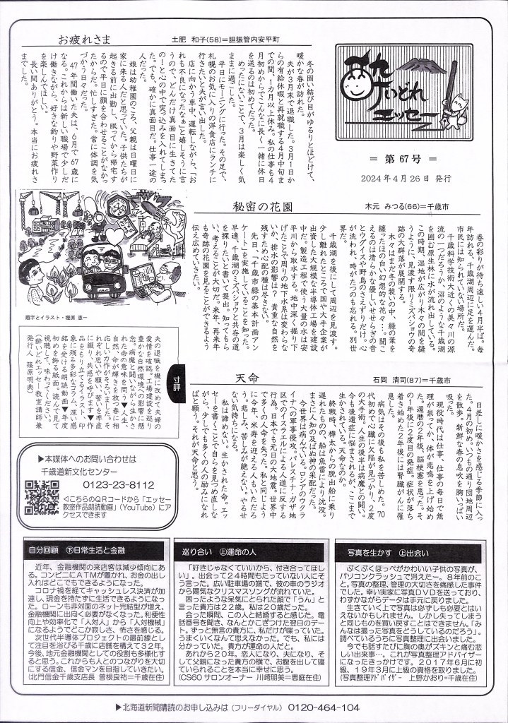 この通信は、千歳道新文化センターエッセー教室の講師・篠原明典先生が発行されている手作り通信です。