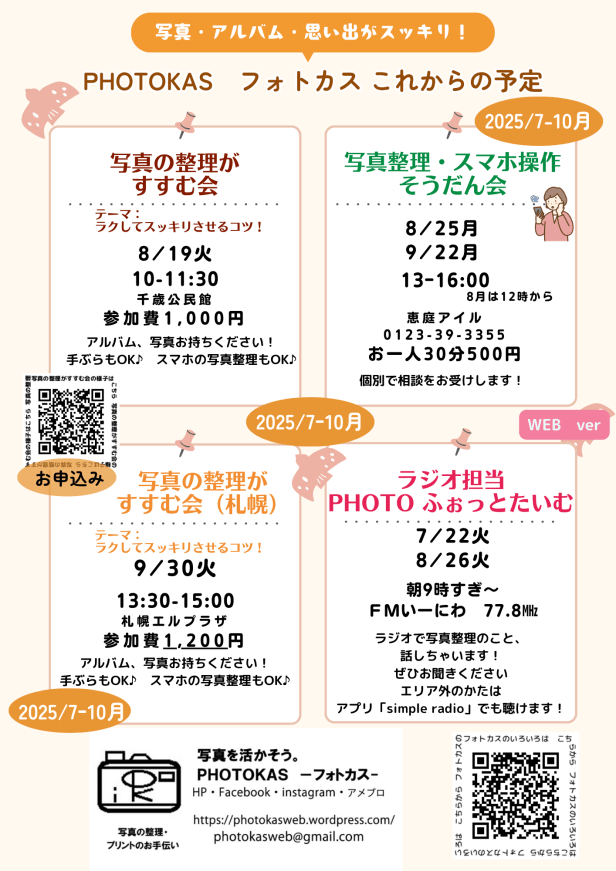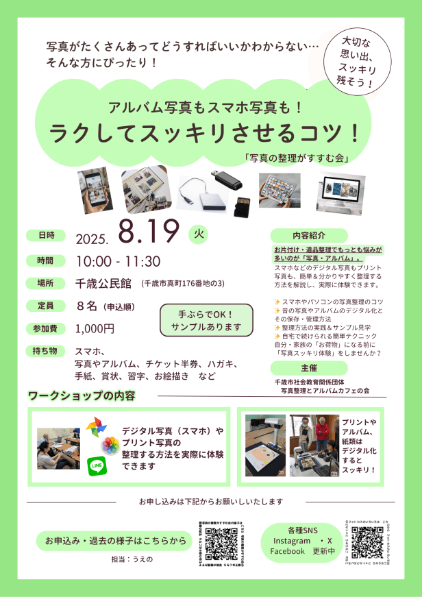 ●8/19火 千歳「アルバム写真スマホ写真スッキリさせるコツ!」(写真の整理がすすむ会)」●