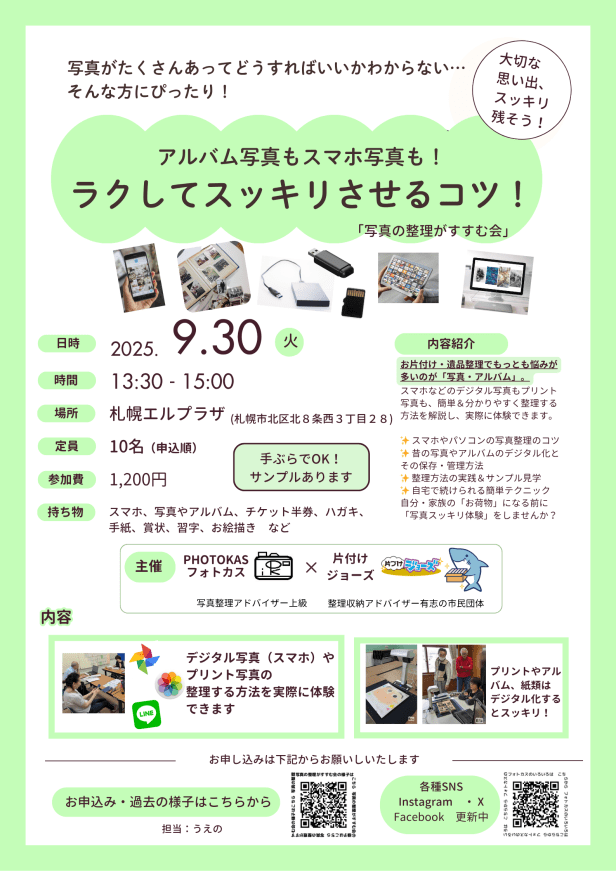 ●9/30火 札幌「アルバム写真スマホ写真スッキリさせるコツ!」(写真の整理がすすむ会)」●